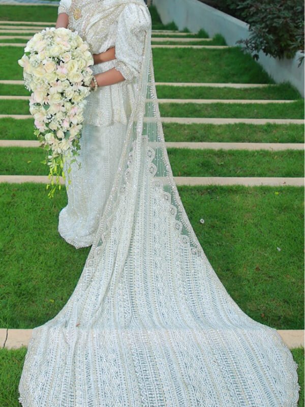 White Kandyan Bridal Saree with Long Trail and Heavy Bead Work – BRD1434