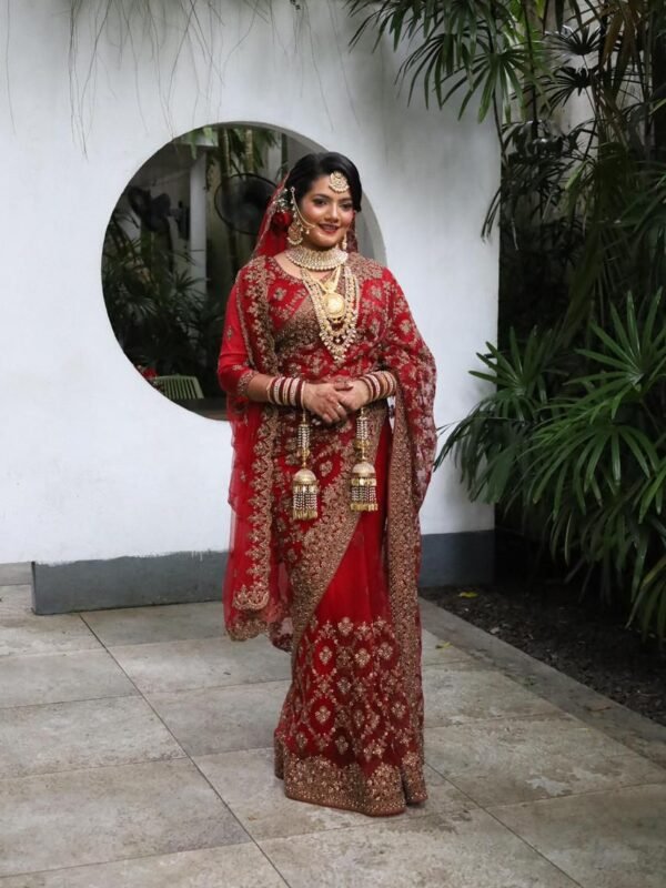 Deep Red Bridal Saree with Golden Embroidery and Shawl – BRD1297