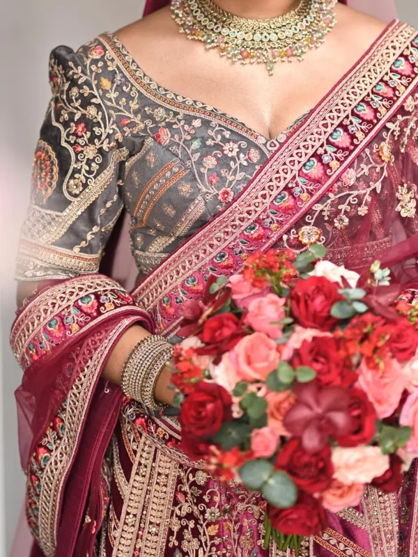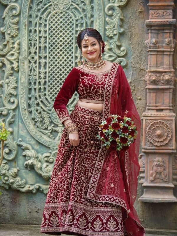 Deep Maroon Velvet Bridal Lehenga with Double shole – BRD1480