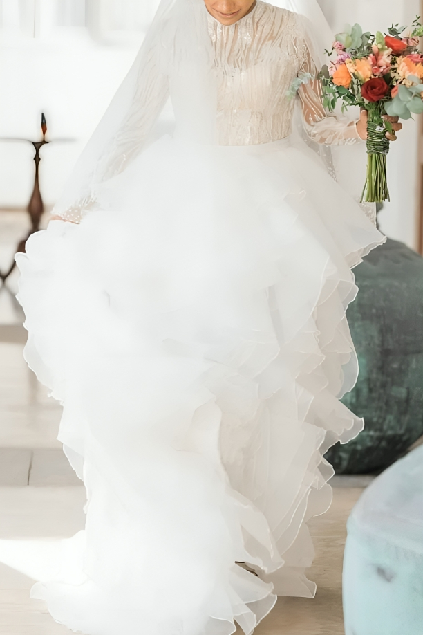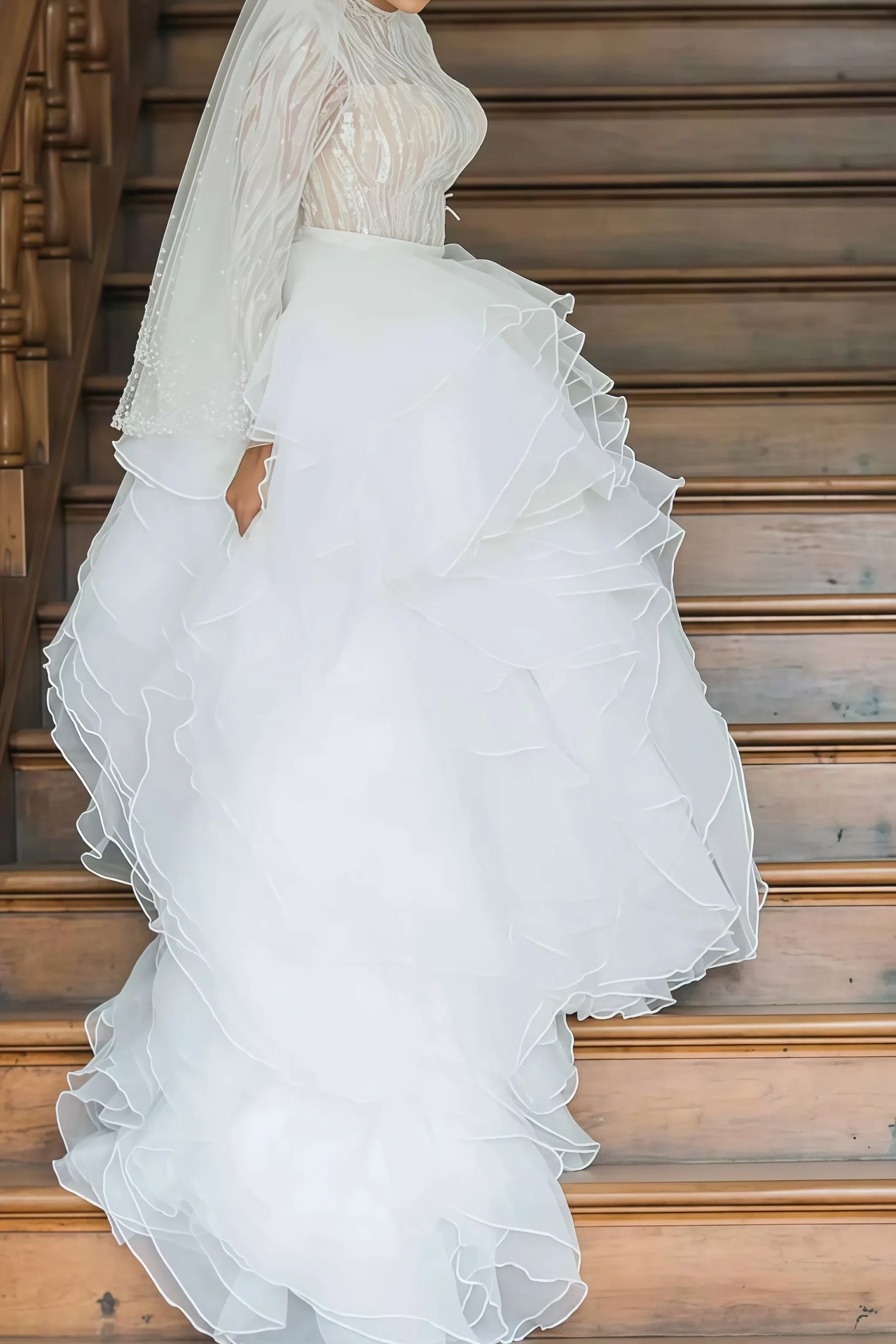 A modern bridal gown featuring a sheer sequin-embroidered bodice with full sleeves and a voluminous layered organza skirt. The flowing veil and metallic high heels add elegance and sparkle, making it perfect for brides who want a contemporary and stylish wedding look.
