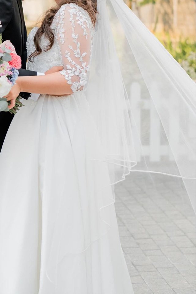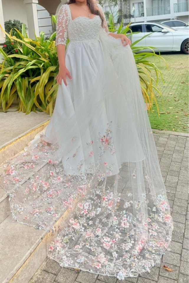 This gown features a fitted lace bodice with half sleeves and a gracefully flowing skirt that transitions into a long floral-embroidered trail.