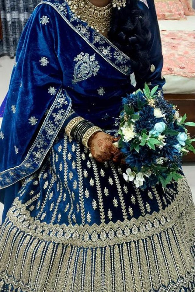 - Deep royal blue velvet lehenga with intricate gold zari embroidery