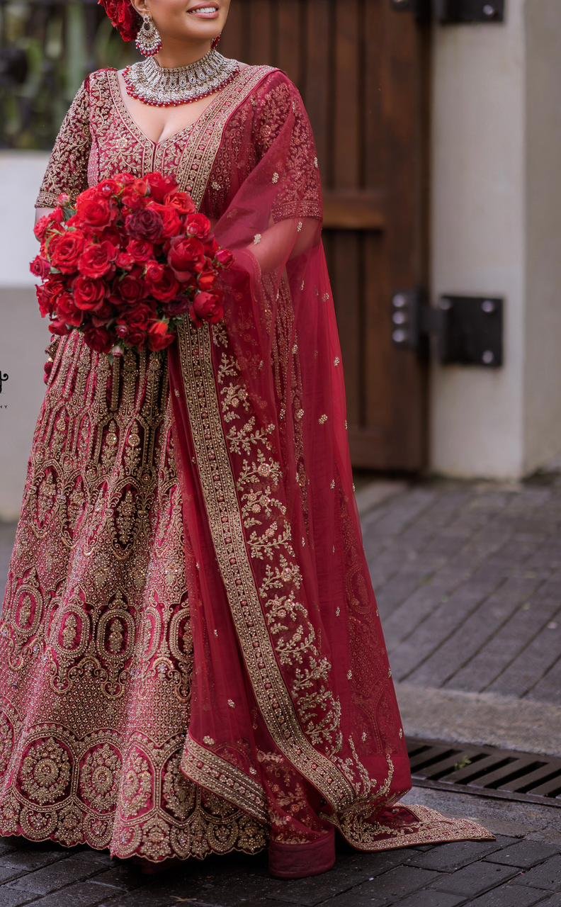 - Deep red bridal lehenga