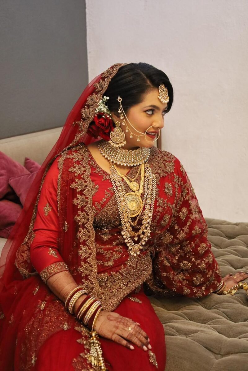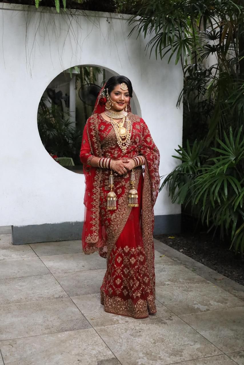 A rich red bridal saree designed with heavy golden embroidery and paired with a matching shawl-style drape. This saree gives the look of an Indian bridal outfit while keeping the elegance of a saree. The detailed work and deep red colour make it a perfect choice for weddings, giving the bride a bold and royal look.
