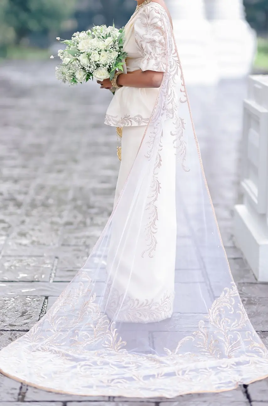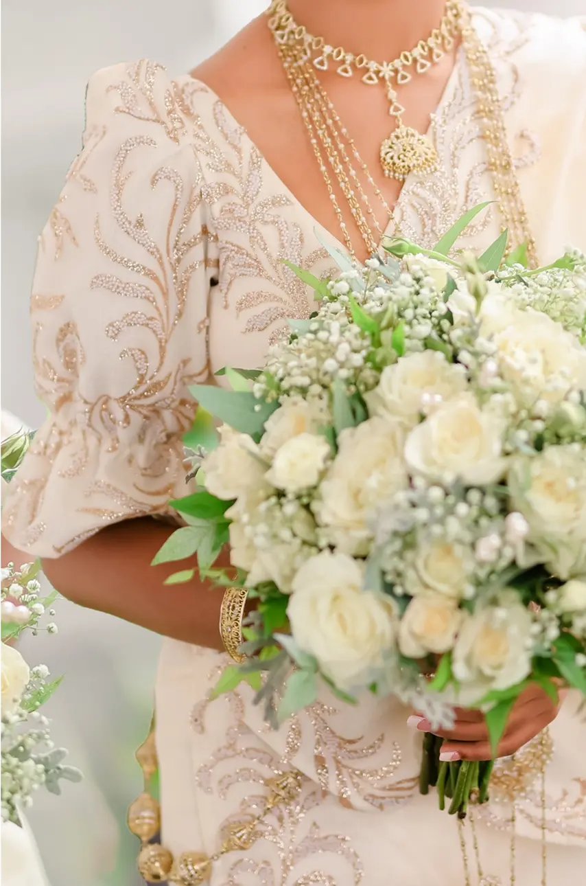 A cream Kandyan saree designed with golden handwork and paired with a puff-sleeve blouse. The saree brings out a graceful and soft look, perfect for brides who want a traditional yet simple style. Matched with gold jewellery and fresh flowers, this saree makes a timeless Sri Lankan bridal outfit.