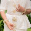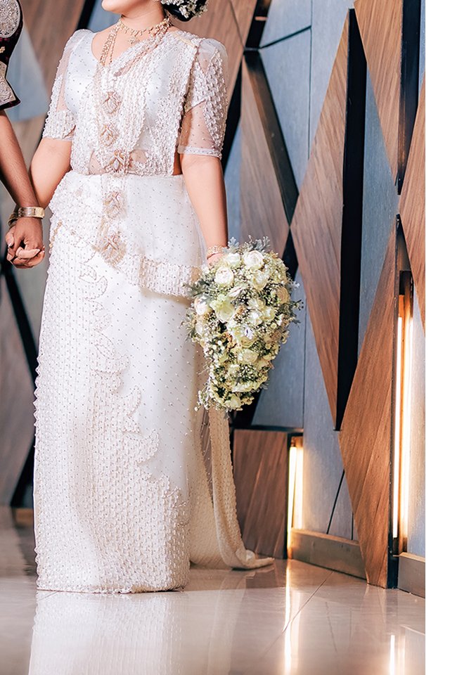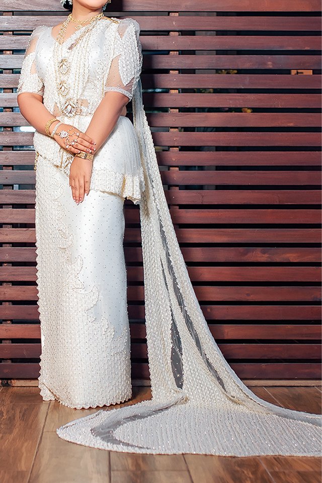 This stunning ivory Kandyan bridal saree is beautifully detailed with golden bead embroidery and soft sheer sleeves. It creates a graceful, royal look—perfect for traditional Sri Lankan brides who love elegance with a touch of sparkle. The design blends classic Kandyan charm with modern bridal sophistication.