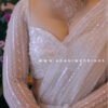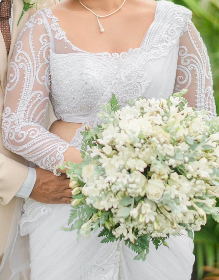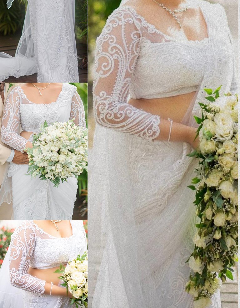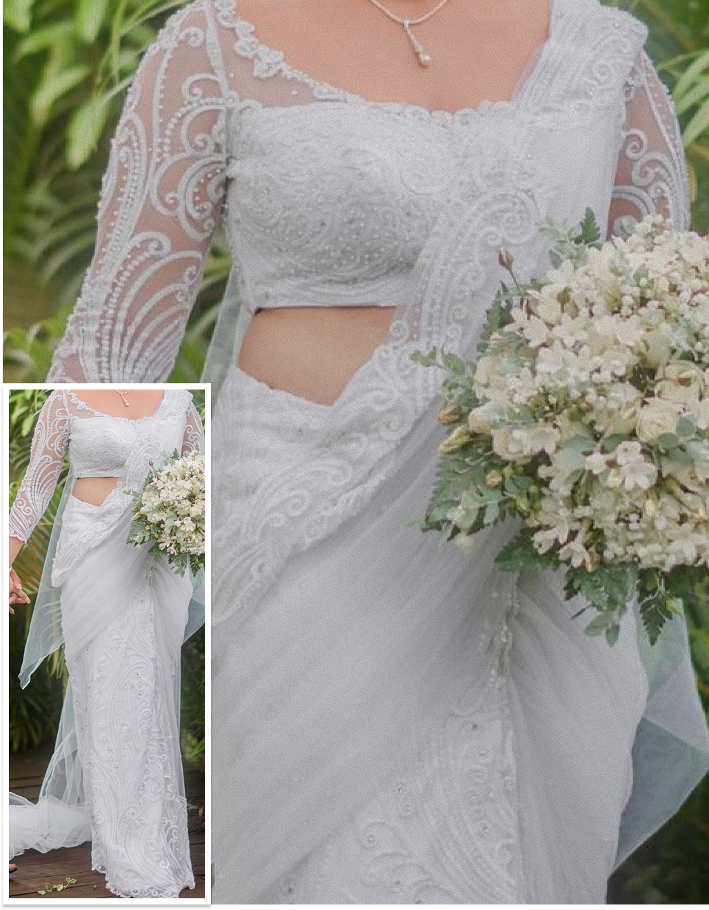 A stunning Kandyan bridal saree that perfectly balances modern elegance with timeless tradition. Crafted in pure white with intricate pearl and bead embroidery