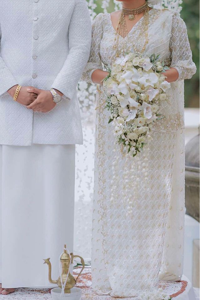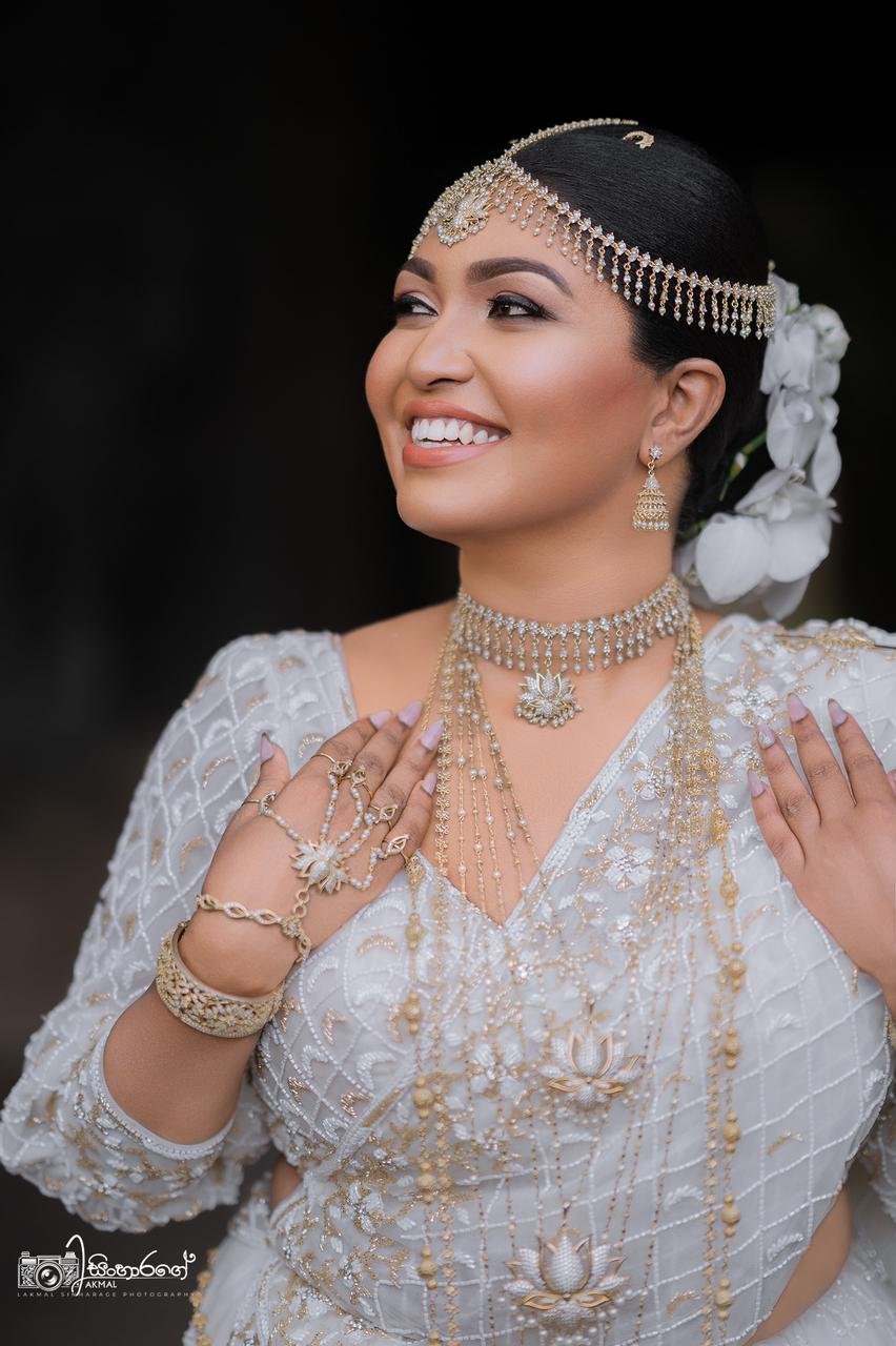 A graceful white Kandyan saree designed for the modern bride. The saree is decorated with fine golden bead and thread work, giving it a soft and rich look. Paired with traditional bridal jewellery and flower hair styling, this outfit is perfect for brides who want elegance and culture in one.