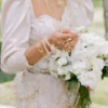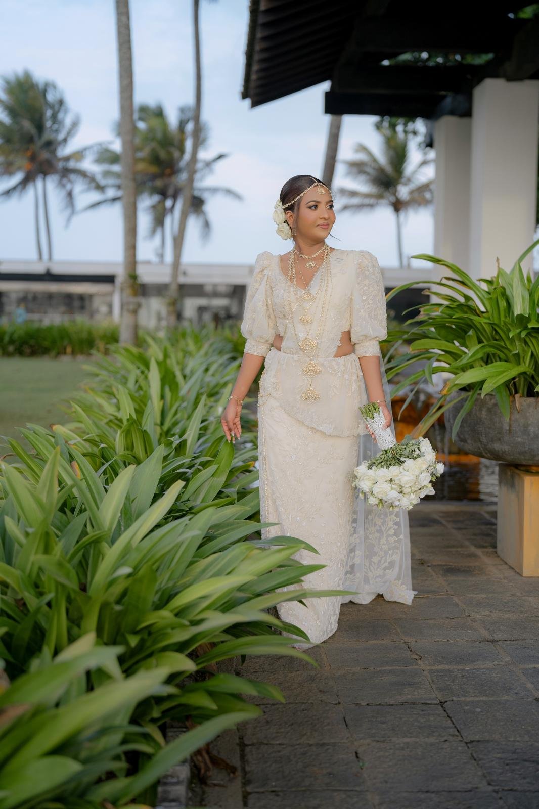A lovely white Kandyan saree designed with lace work and styled with a puff-sleeve blouse. The saree is matched with traditional bridal jewellery and fresh flowers, giving a simple yet elegant bridal look. Perfect for brides who want a graceful and kandyan style on their wedding day.